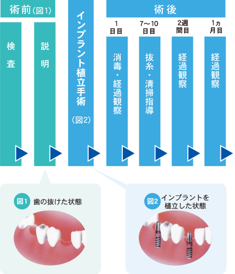 インプラント治療は以下の手順で行います。(期間は症例によって異なります)