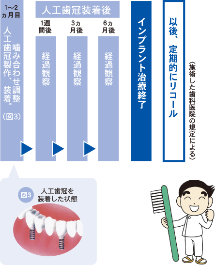 インプラントはアフターケアが非常に重要です。必ずリコールに応じてください。上部構造(人工の歯冠)装着後、原則として一週間後、1ヵ月後、3ヵ月後、6ヵ月後に再診のために来院していただきます。その後も施術した歯科医院の規定に従い、定期検診を受けていただきます。