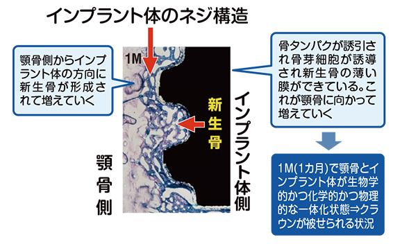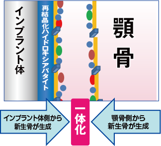 - 1.再結晶によりできた針状・六角柱状のハイドロキシアパタイト微小結晶が骨芽細胞、骨蛋白質を誘導し、新生骨となる、インプラント表面からも骨が形成され骨結合して自分の歯になる。